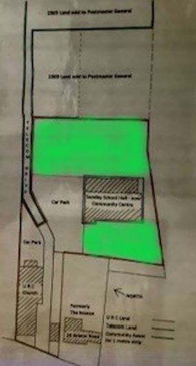 Over the past month, we have been given permission to detect on the land to the rear of the URC and adjacent to the Community Centre. There are two areas of grass that was covered which are highlighted on this sketch. Here we are delighted to share our findings.